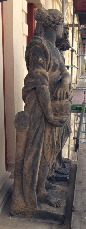 Restoration, color analysis, preservation of existing material, cleaning, pre-stabilization, removal of rusty dowels and fixtures, passivation of the corroded surfaces of the remaining fixtures, shoring up of marginal zones, consolidation of scales and fragments on the original material, reassembly of larger fragments, artistic reconstruction of details in historical application technique, consolidation, restoration of the color scheme, consolidation of still existing loose coloring, pre-retouching, color-matching of additions, implementation of a color scheme matching the original coloring, installation, respectively re-erection, archivable documentation.