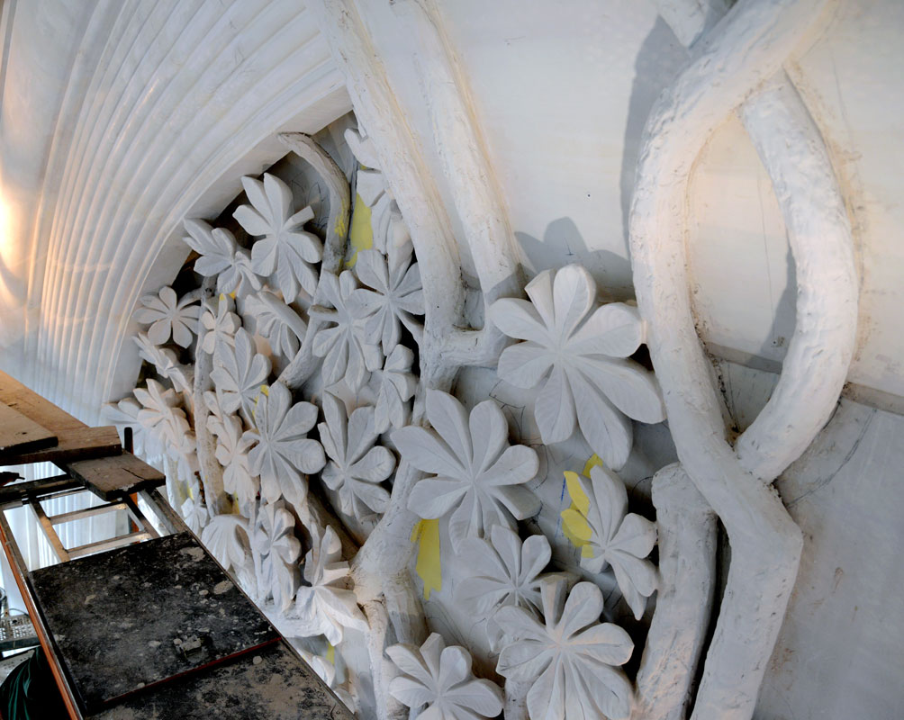 Artistic and sculptural reconstruction of stucco ornaments and figurative representations according to historical photographs.