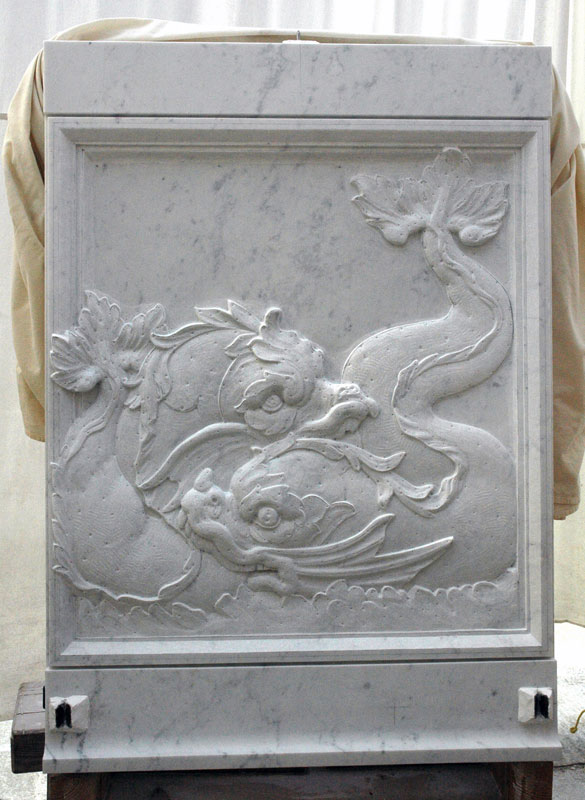 Steinbildhauerische Kopie zweier Reliefs "Kämpfende Meeresungeheuer" (Carrara-Marmor) für den Marmorsockel der Skulptur des Wassers