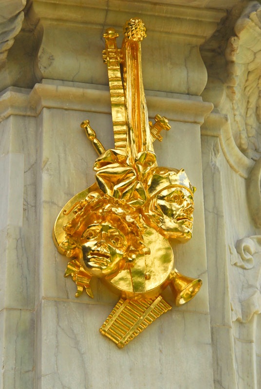 [Translate to englisch:] Rekonstruktion des Bildplastischen Schmucks aus Bronze (vergoldet), Bildhauerische Nachempfindung von drei Maskenfestons im Stil der Zeit und des Autors Rudolf Siemering